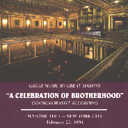 You can now own a wonderful recording of Great Music by Great Masons, A Celebration of Brotherhood recorded in Masonic Hall - New York City. This CD includes selections composed by each of these superior muscians performed by a great orchestra and solosists.